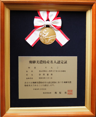 平成10年に飛騨美濃特産名人として認定していただきました。飛騨美濃特産名人は、卓越した技術・見識を有し、地域の農業振興に貢献された方々を岐阜県知事が名人として認定している制度です。